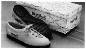 "As far as I know it's the only shoe made from 100% recycled materials," says Julie Lewis, president of Northwest Quality Innovations, Inc., Lake Oswego, Ore. "The fabric lining and outer material is made from 100% waste polypropylene, the sole from reclaimed tire rubber, the tuckboard from recycled la-aft paper bags and coffee filters. The eyelets contain recycled metals, the foam is 100% reclaimed foam rubber. The box, which is also made from recycled materials using water-based inks, is reversible with pictures of endangered animals inside so you can reuse it as a gift box."