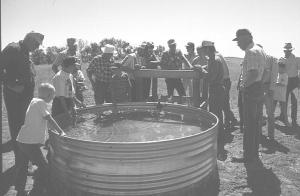 Lubben simply feeds plastic water line down through the metal tube to bury it, running the chisel shank as deep as possible. He runs the water lines out to large water tanks in his pastures. To protect the floats from damage by cattle, he puts posts up around the floats on one side of the tanks.