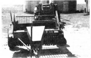 Nuss paid $120 for the baler which had been damaged in a fire. He removed the tailgate, belts and rollers, and most of the sheet metal behind the axle, keeping only the baler's pickup, drum, and axle. -He shortened the chain that drove the rollers and drum and remounted it on the left side of the baler so the drum would rotate in the same direction as the pickup to keep the crop moving rearward.