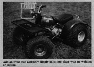 Once converted, the 3-wheeler weighs just 40 to 45 lbs. more. The kit, available for Honda 110's and 90's, sells for $389. Moritz plans to have kits available for other Honda models, as well as Suzukis and Yamahas in the near future.