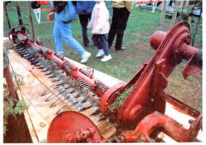 Linkiater's invention consists of a series of combs made out of loops of metal rod attached to a rotating shaft positioned just inches above the cutterbar on a standard sicklebar mower. Powered by separate drive and gearbox driven off the pto, the giant comb spins at about 800 rpm's, raking through hay stalks as they come up against the cutterbar.