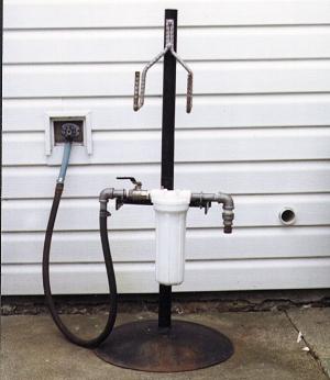 I use a common household-type water filter to clean the water as it goes into my sprayer tank. The filter attaches to a 3-ft. high metal pipe stand. I made the stand by welding a 3-ft. long, 3/4-in. dia. steel pipe into the center of a 2-ft. dia. disc.