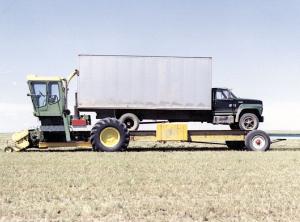 The Vauxhall, Alberta, farmer-inventor carries a 3-ton truck on the back of his Deere 5400 harvester. When the truck gets full, he drives it off the 22-ft. deck and heads back to the farm.