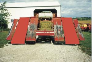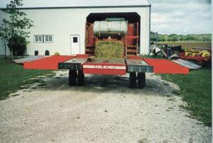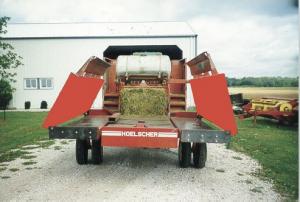 Hoelscher's 1030 bale accumulator is pulled directly behind mid-size balers like the Case-IH 8575, Hesston 4755, Deere 100, New Holland 590, or the Claas Quadrant 1100 baler. It'll handle bales up to 31 1/2 in. sq. and 8 ft., 2 in. long.