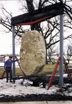 The 12-ft. high, 8-ft. wide granite rock hangs about 18 in. off the ground. It's held up by a threaded steel bolt that runs all the way up through the rock to a homemade swivel that allows it to sway in the wind.