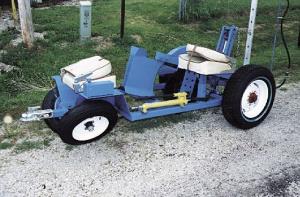 The planter has several unique features. It's made to be pulled behind a tractor and has a plow opener and boot for inserting tree seedlings. The plow opener is controlled by hydraulic pressure off the tractor, or it has a hand-operated jack that does the same thing.