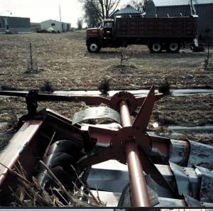 I used the center tube, mounting arms, and several of the spokes from a batt reel off an old 20-ft. wheat table. The tube was just the right length for my combine's 8-row corn head. I added several 16-in. wide, 24-in. long paddles which I made from continuous belting off a conveyor. I positioned the paddles and spokes over the row snouts, instead of the rows, so as not to impede the harvest of standing corn. The reel is driven by a hydraulic motor from the wheat table and is manually raised and lowered by a pair of come-alongs attached to the back of the corn head, one at each end.