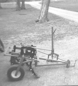 The mini chisel plow rides on a pair of 8-in. wheels off an old riding mower and is equipped with five shanks that dig up an area about 2 1/2 ft. wide. Schueller can adjust shank depth right from the tractor seat by pulling on a handle that's connected to the rear axle. The handle locks in place anywhere along a notched column.