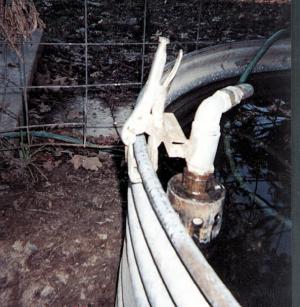 A metal bracket welded to a float valve, as well as to a vise grip welding clamp, makes it easy to move the float from tank to tank in freezing weather when you can't leave hoses and hydrants on all the time. Just hook the bracket to the top of the tank and come back in a little while when the tank is full, then shut off the water and take the hose and float with you. It keeps the tank from running over.