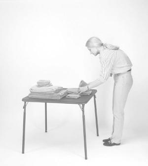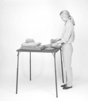 The "Right Height Table" adjusts from 28 in. tall to 40 in. You can also set it at 32 or 36 in. A push button mechanism on each leg makes it easy to raise. Features a washable vinyl top.
