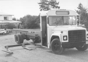 He cut off the bus body behind the driver's seat and used a sheet of plywood, with a big window in it, to close in the "cab". He removed the axles from the Highline trailer and bolted the remaining framework to the bus chassis. He used 3-in. dia. steel pipe to build a rocker arm on one side of the trailer, which stops the bale as it's loaded onto the trailer.