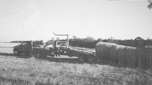 To load a bale, the lift arm places a bale on the belt and then it's moved back far enough to make room for the next bale. The bales are contained on the belt by side-mounted steel rails that are adjustable in height according to bale size. To unload the bales, the operator slowly drives forward and runs the bales off the back one at a time. Or, he can unload all bales at once by pulling on a rope to release a catch. The weight of the bales then tips the trailer backward so that all bales come off in a row as the driver pulls forward.