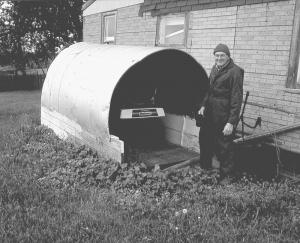 He cut a 2-ft. chunk out of the side of each feeder so they could be spread out like a quonset and positioned end-to-end. Boards screwed to the bottom and back end of the shed provide stability. He also bolted the ends of the two feeders together where they meet in the middle.