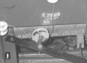 "I solved the problem by mounting a small pulley on front of the baler for the string to travel under. When the string moves, the pulley moves, too. I painted part of the pulley black so that I can see at a glance whether the string is moving or not. The pulley - which came off a boat steering apparatus - is simply bolted in place."