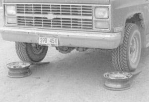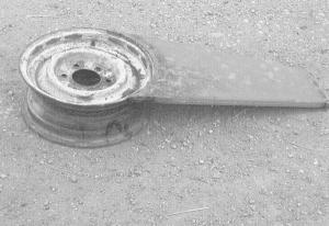 May welded pieces of 1-in. thick flat steel tubing to a pair of 15-in. car wheels.