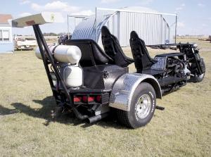 "I mounted the radiator on back of the trike because it was too big to go on front. The radiator is 36 in. tall and mounts at a 40 degree angle. I built a frame around it to help it scoop air in. There are a couple of fans next to the radiator that automatically go on whenever the engine gets too hot. However, the radiator does such a good job that even on a 100 degree day I can let the engine idle and the fans won't even turn on. With the radiator laid over at a 40 degree angle, the heat goes up and creates its own vortec which draws so much air in that the fans aren't needed."