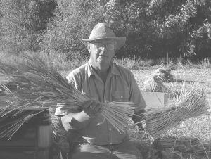 The second harvest is a "dry" harvest of white bearded wheat, done just before the kernels mature in late July to early August. This time, they use two restored 40's era grain binders û one with an 8-ft. header, and one with a 10-ft. header. With these units, they harvested close to 200,000 lbs. of wheat last year.