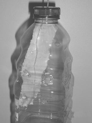"Just take a clear plastic bottle like an Ocean Spray juice bottle and drill a tiny hole through the center of the cap," he explains. "Then, take a piece of yellow plastic and wrap it around a piece of wire or a clothes hanger. Hang the yellow end of the wire under the cap so that it dangles inside the bottle, and use the other end of the wire as a hanger for the trap."