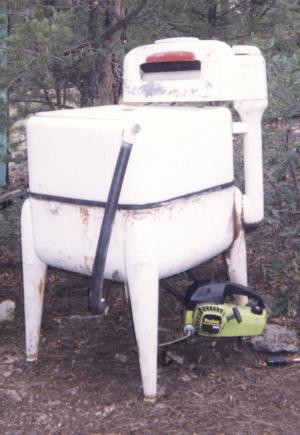 I spent last summer in the Colorado mountains with no power so I had to work with what I had. To wash clothes, I used an old wringer washer powered by a chainsaw motor. I had to try a few times to get it geared right so it wouldn't toss clothes and water out in the first few seconds. But once I got it set, it worked well. Everyone on the mountain could sure tell when it was wash day. (Jim Moon)