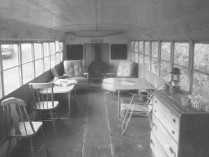 To add to the winter fun at their toboggan/ski hill, the family has an old school bus parked at the bottom of the hill for shelter. They took the bench seats out and installed a wood stove.