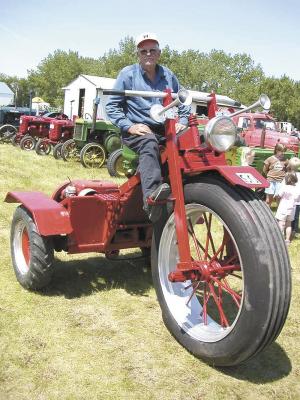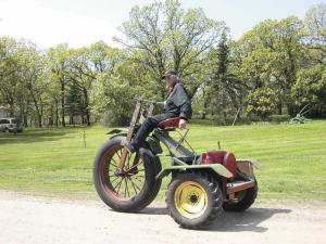 "The big, spoked front wheel with an 11 by 36-in. tire came from a 1950's combine. The two small back wheels are off a corn planter," he says. "We used some angle iron and metal parts off a drill for the frame, including the front wheel steering spindle. The front forks were made from 2 by 3-in. steel tubing."