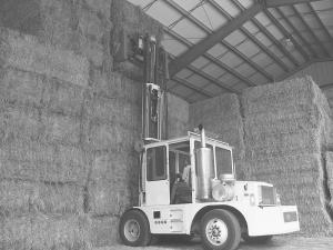 "It's better than a conventional loader tractor because it goes much faster down the highway, in fact over 60 mph, and can lift big square bales up to 27 ft. high," says Strubhar.