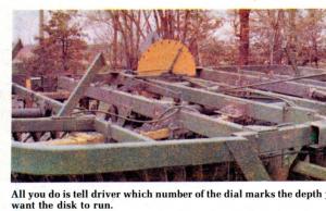 This home-built depth gauge, designed by South Dakota farmer Ervin Jensen, of Beresford, eliminates guesswork. It's tied to a large dial with numbers which are easily read right from the cab. All you do is tell the driver which number on the dial marks the depth you want the disk to run. Then, all the driver has to do on every turn in the field is adjust the hydraulic control lever until the depth gauge dial points to the right number.