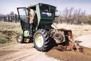 The benefits outweigh that problem. Volk appreciates the added comfort of working in a heated cab, and trenching is made easier with a used Pathfinder Freedom Drive he hooked into the hydraulic steering and attached to the front. Volk marks a shallow line by securing a shovel to his pickup's bumper and driving where he wants the trencher to go. The Freedom Drive follows the line - whether it's straight or curved' - for hands-free steering.