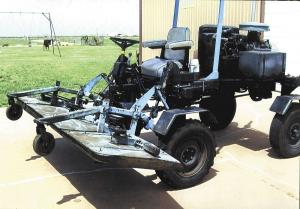 The machine rides on four 15-in. car tires and is equipped with a home-built, pto-driven deck that has five 22-in. lawn mower blades. The deck can be hydraulically raised up to 2 ft. off the ground. A home-built canopy keeps the driver in the shade.