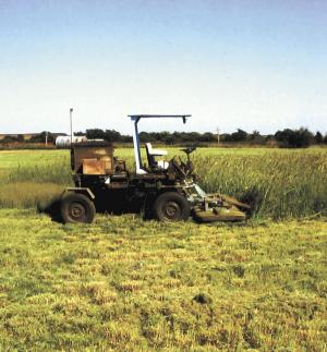 The machine rides on four 15-in. car tires and is equipped with a home-built, PTO-driven deck that has five 22-in. lawn mower blades. The deck can be hydraulically raised up to 2 ft. off the ground. A home-built canopy keeps the driver in the shade.