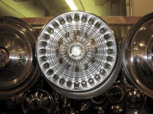 Wilson gets hub caps from junkyards and occasionally from private collections. "These are original antiques, not replicas. All the hubcaps retain their original patina with their dents, dings, and curb issues. I want to sell the character of the car," says Wilson. "Customers can request the kind of hub cap they want, but it's not possible to find every car model. The inventory is constantly changing."
