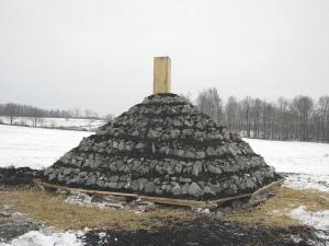 He then layered it with the coal on top of a wooden platform covered in straw. In the center of the pile, a wooden chimney provided air and draft to the burn. A layer of clay built up around the sides worked like a kiln to hold the heat in.