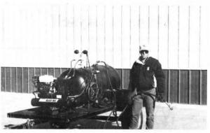 Sage mounted a 5 hp air compressor on a 2-wheeled trailer and hooked the compressor hoses up to an old 150-gal. pro-pane tank. The compressor creates vacuum inside the tank. A 15-ft. long hydraulic hose, connected to the tank, sucks used oil out of engine oil pans and into the tank. By reversing pressure within the tank, the compressor can be used to blow used oil out into a larger tank where it can be picked up and later recycled.