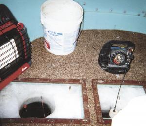 He used a circular saw to cut a door into one side and to cut the windows. The floor is 3/8-in. thick plywood covered with carpet. There are 3 ice fishing holes in the floor, each equipped with a latch-type wooden door. Two padded, swivel-type boat seats are attached to a home-built metal frame that bolts onto the tank.
