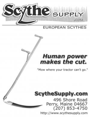 Contact: FARM SHOW Followup, Scythe Supply, 496 Shore Rd., Perry, Maine 04667 (ph 207 853-4750; email: scythe@scythesupply.com).