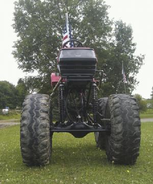 Jacked Up 4-WD Monster Mower FARM HOME Lawn Mowers 31h 38 Folks can’t believe their eyes when they see this 4-WD “Monster Mower” garden tractor built by Tony Gernstl of Farmersville Station N Y It rides on 44-in high lugged wheels off a 4-WD “monster” pickup with the driver sitting about 6 ft off the ground The 1980’s tractor still has its original Briggs & Stratton 18 hp twin cylinder engine and 3-speed transmission The axles came off a Suzuki Samurai SUV “I built it using parts from 3 different Yard Machines that were headed for the junkyard ” says Gernstl “I drive it in parades and at farm shows and car cruise nights It’s fun to see the look on the faces of little kids when they see me drive by ” He cut the axles down and made a suspension system similar to a Ford twin I-beam system complete with radius arm-style linkage with coil overshocks He rotated the tractor’s transaxle 90 degrees and installed a sprocket on one of the wheel hubs which is used to chain-drive both the SUV’s driveshafts He also replaced the tractor’s original steering assembly with a heavier duty rack and pinion steering assembly off a Chevy Chevette The rig is equipped with a unique hydraulic brake assembly that uses the rotor off a Yamaha dirt bike the calipers off a Bombardier snowmobile the hydraulic master cylinder off a Toyota Rav 4 SUV and the remote cylinder off a Yamaha dirt bike A small tank assembly feeds brake fluid through a hose down to the master cylinder Pushing down on an aluminum pedal activates the cylinder “I have to climb up one of the rear wheels or use a small ladder to reach the seat but once I’m up there it’s a lot of fun to drive ” says Gernstl “I bought some of the stuff I used to build it off Craigslist but the rest is all pretty much second hand items “When they first see it a lot of people want to know where the mower deck is Others ask me how fast it’ll go When I originally built it I could go up to 25 mph but that wasn’t too safe so I geared it down and now the top speed is only about 15 mph ” Both sides of the rig are equipped with 3-ft lengths of curved stainless steel exhaust tubing which Gernstl made out of handicap rails designed for toilets “It sounds a lot like a Harley Davidson motorcycle I think that’s because the tractor is quite old and its governor assembly has an erratic idle which makes it sound like the tractor is souped up ” says Gernsti He made the body by bolting together sheet metal off the 3 different Yard Machine garden tractors “The sheet metal was in good condition It saved me the hassle of having to repaint the tractor ” notes Gernstl Contact: FARM SHOW Followup Tony Gernstl 10310 Rt 98 Farmersville Station N Y 14060 ph 716 676-2149; pull@localnet com