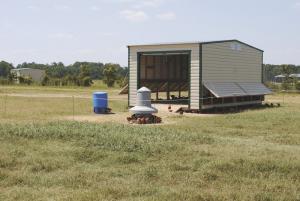 When the chickens have cleaned out an area, the skid shelters are moved 50 to 75 yards to fresh pasture. How often depends on the size of the chickens and how much they are scratching and eating.