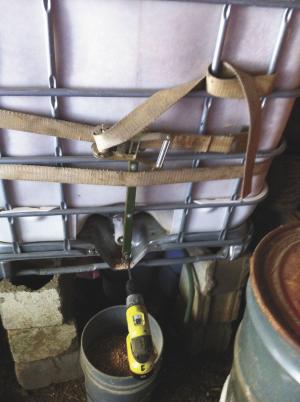 “The IBC container has a 6-in. dia. opening at the top and a 2-in. dia. outlet at the bottom that would have been too small for grain to flow out freely,” says Baldwin. “I removed the flapper valve from the outlet so I could insert the bulb planting auger into it. The auger shaft always stays with the container, and whenever I want to unload feed I just attach the drill to it.”