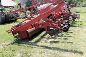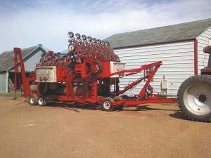 First-Of-Its-Kind “Pave And Plant” Row Crop Planter PLANTERS This past winter Brian Hoogestraat built an entirely new planter that rolls his fields and plants in a single pass His “pave and plant” rig as he calls it creates a tabletop smooth surface for planting The 24 planter units on 22-in spacings mount behind the rollers “I mounted an IH cyclone box on top of each roller with their drive wheels running on the rollers ” says Hoogestraat Hoogestraat has been collecting parts from old planters over the years He used the design of an 8-row IH 800 planter with its pivot transport in his frame design In fact his Pave and Plant works like 3 IH 800’s two of which pivot He started out by building a 3-section frame out of 7 by 7-in square tubing salvaged from old planter frames The frame supports both the rollers and planter units “I built the rollers out of 1/2-in thick 24-in dia oil well pipe ” says Hoogestraat “The center roller is 12 1/2 ft long and the two wings are each 16 ft long ” He capped the rollers with 1/2-in steel plate and mounted them in the frame with 3-in shafts and roller bearings The center roller is positioned to ride just behind and slightly overlap the wings The planter units ride behind the rollers When hydraulic lift is applied at the headlands the center roller tips forward lifting off the ground This also raises the planter units and disengages the planter drive If lift continues all 3 roller sections tip forward eventually raising the planter units into a vertical position the rollers off the ground and the two wings onto their transport wheels As lift continues and the tractor moves ahead the wings pivot behind the center unit To get the extreme lift needed to raise the 3 sets of rollers and planters Hoogestraat combined 4 hydraulic cylinders into two He butt-welded each pair of 3-in dia cylinders with 20-in strokes into one “With the rams going out in either direction I got the 40-in strokes I needed ” says Hoogestraat Folding the wings into transport position the way he did also meant that the marker arms had to be modified They couldn’t fold into a vertical position when not in use Plus they had to be 20 ft long To get the extra length and reposition them for transport Hoogestraat fabricated two-piece marker arms to fold first on themselves and then back against the side of the pave and plant He used wing mounts from an old cultivator for the final fold “It worked great this spring and we had very few problems ” reports Hoogestraat Contact: FARM SHOW Followup Brian Hoogestraat 27515 464th Ave Chancellor S Dak 57015 ph 605 310-0123; bhoogy@hotmail com
