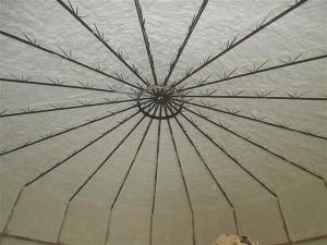 Hanging the trusses was the trickiest part of the process Rubingh cut them to the right angle and then cut a 3-ft long 9-in dia steel pipe to use as a center collar He used a man-lift and a telescoping forklift to set each truss in place He welded them to the collar and secured them to the sidewall Once they were all in place he reinforced the center with a second steel ring welded to the underside of the trusses
