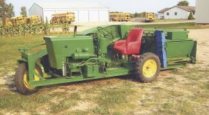Power comes from a 4-cylinder engine that once ran a self-propelled Deere swather The engine mounts directly to the frame and is covered with custom-formed sheet metal To the casual observer it looks almost like a small factory-built tractor with a mounted picker The engine shaft goes through a 4:1 belt reduction assembly before mating with a 4-speed transmission from an old Chevy truck “First gear gives me an operating speed about as fast as a person can walk ” says Don “and 4th gear has a top speed of about 15 mph Braking is done with the original hand-operated emergency brake ” The transmission also produces 540 rpm power that runs the picker
