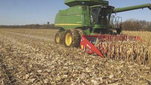 "You end up running the combine for the sake of chopping corn instead of picking," says Bruch. "The slower speed means ears aren't flying around, there's a lot less shelled corn and the combine takes less fuel."