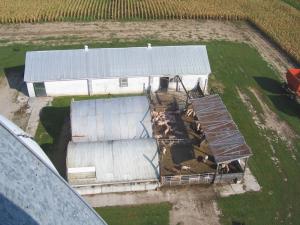 The slab extends 20 ft. outside the open end of the buildings so pigs have an area for exercise, eating and drinking. Hartemink mounted the original grain bin roofs on metal posts to create a carport-like roof that covers the feeders. One frost-free drinker is shared by both pens. Runoff from the slabs and roofs goes into a 4 ft. wide gutter that runs across the front of the slab. That empties into a larger pit, which also serves the conventional barn.
