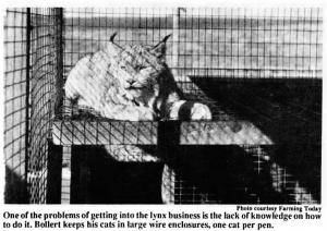 Raising lynx is a slow business. Bollert got started in 1979 with a pair of cats trapped up in northern Canadian and he's been building up his breeding herd ever since. No pelts have yet been sold. He now has a herd of about 60 animals, 35 of which are female. He says he's ready to start selling limited numbers of breeding stock.