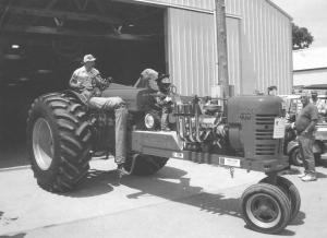 Stretched IH 400 Is A Real Show Stopper TRACTORS Antiques As he grew up on a Missouri crop farm in the 1960’s Ron Strange dreamed of one day reconfiguring an old tractor with a V-8 automobile engine Almost 30 years later Ron bought a rusted out heap of metal that at one time was a chassis to a Farmall 400 Over the next nine months Ron and his brother Art dismantled cleaned fabricated and put together a specialty tractor they named “Big Red” The name was chosen because at 6 000 lbs Red was really a stretched out and vastly reconfigured tractor from the original “We first thought the 351 Cleveland V-8 from a 1972 Mustang would replace the tractor motor and that we’d use the original tractor transmission ” Ron says “That all changed when we decided to use the automatic transmission from another car project instead We stretched the frame 4 ft and mounted it behind the motor and in front of the gas tank ” The rebuilt 400 was beginning to look more like a dragster than a tractor and they weren’t finished with modifications Ron’s wife suggested that the 4-ft platform above the automatic transmission would make a nice place for mounting a Farmall pedal tractor Another creative touch was two large pedals underneath the small tractor and two custom “legs” to move the pedals Ron and Art built the legs from square steel tubing and Linda contributed custom made denim pants and an old pair of cowboy boots The oversize 400 really turned heads in parades especially when Ron activated the 12-volt motor that moved the pedals and gave viewers the idea that Big Red was just an overgrown pedal tractor Because of health issues Ron is unable to drive his fancy creation now so his wife Linda is the main pilot “I gave her a few lessons in handling that special transmission and how to load and unload it from the trailer and she does a great job ” says Ron “I’m just happy to see Big Red back on the show and parade circuit turning heads and making people proud of a 60-year-old Farmall ” Contact: FARM SHOW Followup Ron and Linda Strange 32409 E Colburn Road Oak Grove Mo 64075 ph 816 500-1445