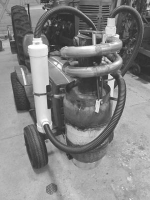 A charcoal fuel system requires a burner, a cooler, and a way to filter the gas before it enters the engine. Davis modified a 30-lb. propane tank to make the burner unit. He inverted it and cut a hole in the “new” top. This allowed him to clean it of any residue and to mount a tube to hold charcoal.