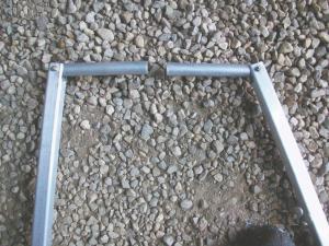 Unable to find a ladder with a wider base, Rogers decided to make braces to reinforce and stabilize his existing ladder. He cut short pieces of 1-in. aluminum pipe sized to fit inside the rungs of his ladder. He then cut 1-in. slots in the ends of 8 to 10-ft., 1 1/4-in. square aluminum tubing. After drilling holes through the square tubing and the pipes, he bolted them together.