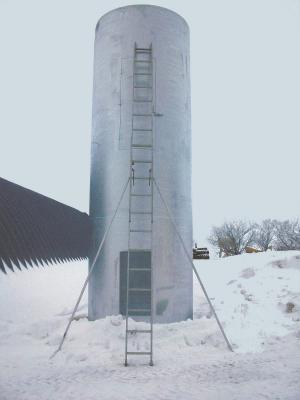 “Extended to maximum length, extension ladders get pretty wobbly and springy. Against a round building, they can fall to either side pretty easily and quickly,” says Rogers.