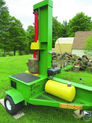 The splitter stands almost 10 ft. tall and weighs about 2,000 lbs. A 12-volt winch is used to raise and lower the 5-ft. long loading arm, allowing Hollmen to stack logs from ground level and then raise the arm for use as a table. When he’s done splitting logs, the arm folds up vertically for transport.