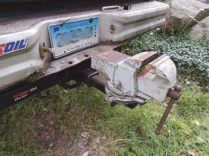 “I bolted a steel plate onto the vise and then welded the plate to a length of 2-in. sq. tubing. I also drilled a 5/8-in. dia. hole in the tubing to accommodate the hitch pin. Now whenever I’m away from the shop I slide the vise into the hitch, insert the hitch pin, and have a vise wherever my pickup is.”